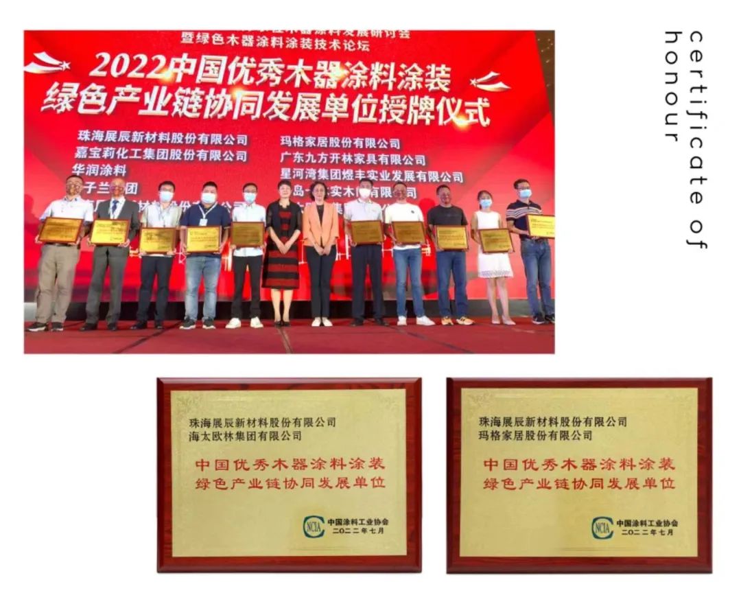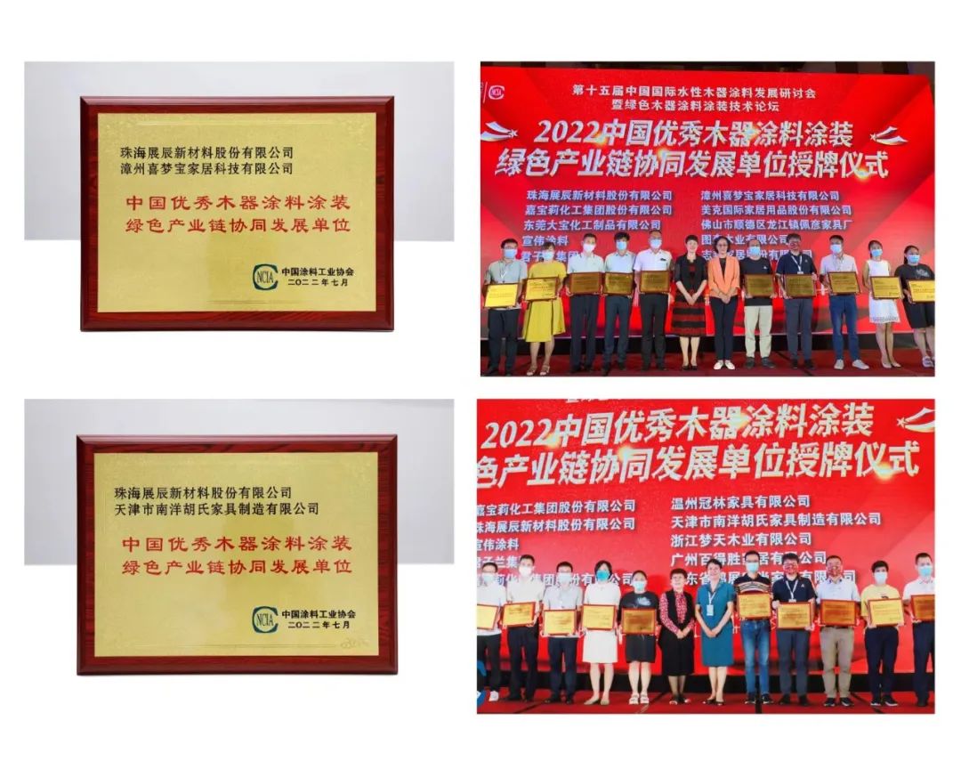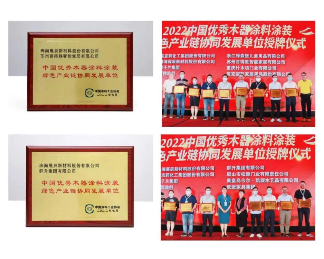 展辰新材與海太歐林、南洋胡氏家具、群升集團(tuán)、百得勝智能家居、喜夢(mèng)寶家居、瑪格家居一起,被評(píng)為“2022中國(guó)優(yōu)秀木器涂料涂裝綠色產(chǎn)業(yè)鏈協(xié)同發(fā)展單位”。