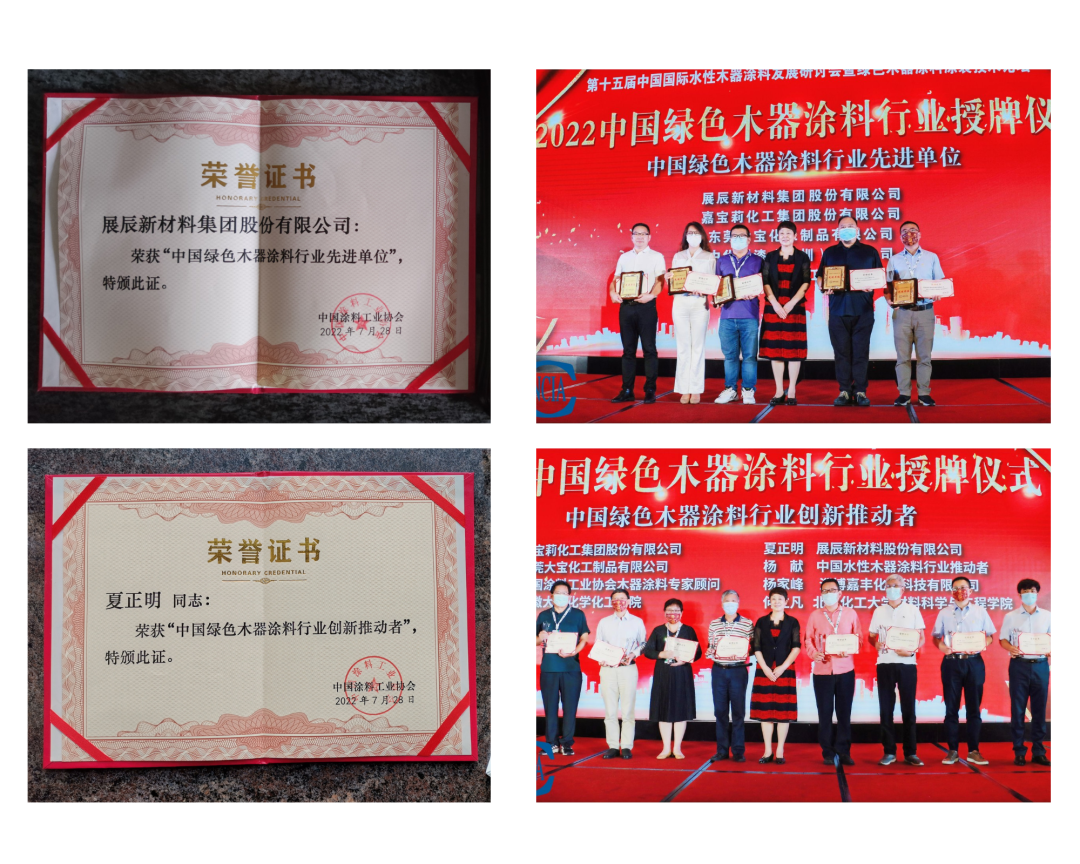 展辰新材料集團(tuán)股份有限公司榮膺“中國(guó)綠色木器涂料行業(yè)先進(jìn)單位”稱號(hào),同時(shí)展辰新材料集團(tuán)股份有限公司夏正明榮獲“中國(guó)綠色木器涂料行業(yè)創(chuàng)新推動(dòng)者”稱號(hào)。
