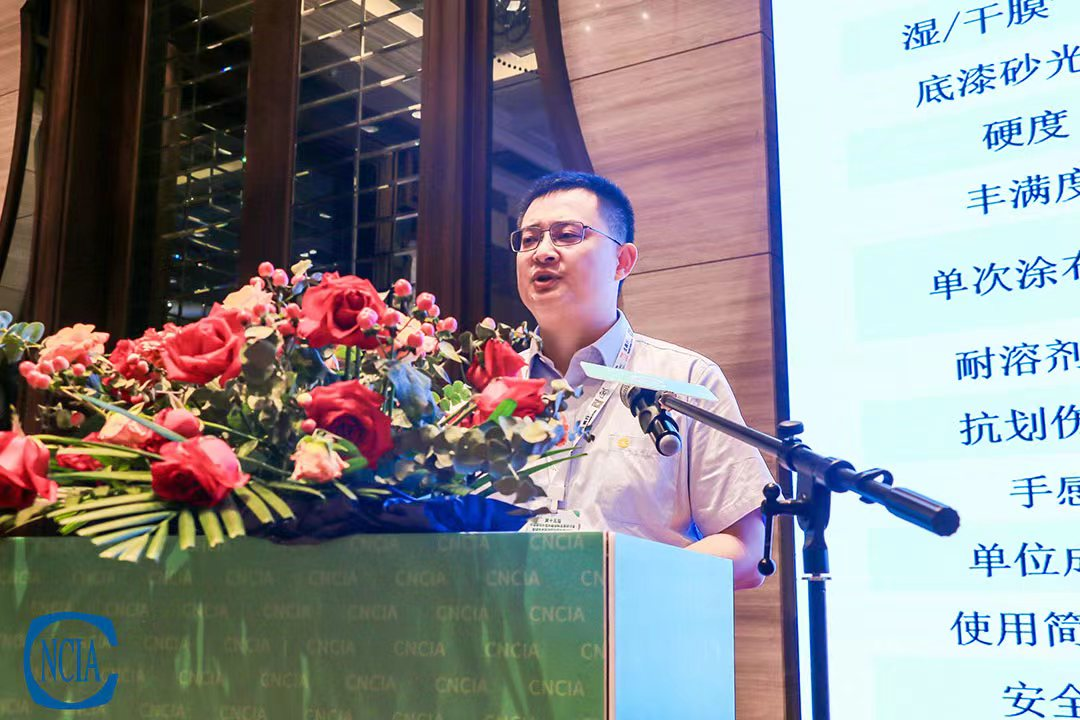 在會(huì)上,展辰技術(shù)管理中心涂料研發(fā)部經(jīng)理夏正明還為大家?guī)砹恕督堤紲p排—木器綠色涂裝創(chuàng)新方案分享》的主題演講,從實(shí)際應(yīng)用角度講解水性木器涂料降碳減排的新思路和新工藝。
