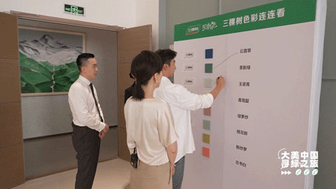 但想要成為一名合格的“粉刷匠”,需要經(jīng)過(guò)多重考驗(yàn)。三棵樹(shù)乳膠漆產(chǎn)品有多達(dá)1800種顏色,從選色到命名都融入了中國(guó)傳統(tǒng)色彩文化的深厚底蘊(yùn)。在體驗(yàn)“辨色”的過(guò)程中,武大靖最為傾心的“云霓翠”,也是三棵樹(shù)“國(guó)漆國(guó)色”主推色之一。