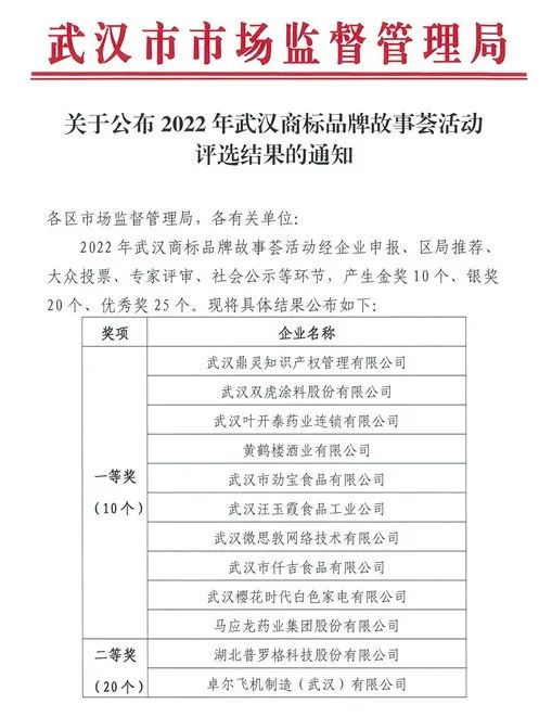 為大力推進(jìn)知識產(chǎn)權(quán)強(qiáng)市建設(shè),傳播武漢商標(biāo)品牌好故事、好聲音,提升武漢商標(biāo)品牌知名度和影響力,助推全市高質(zhì)量發(fā)展,由市區(qū)市場監(jiān)督管理局組織開展的“武漢商標(biāo)品牌故事薈”活動于2022年4月開始舉行,全市各界經(jīng)企業(yè)申報、區(qū)局推薦、大眾投票、專家評審、社會公示等環(huán)節(jié),至2022年9月產(chǎn)生金獎10個、銀獎20個、優(yōu)秀獎25個,武漢雙虎涂料股份有限公司榮獲金獎。