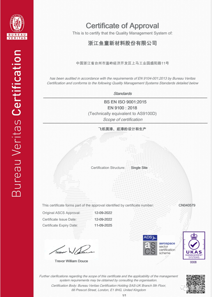 2022年9月,魚童取得了法國(guó)BV公司的AS 9100D航空航天裝備質(zhì)量管理體系認(rèn)證證書,標(biāo)志著魚童正式進(jìn)入航空涂料賽道并獲得了國(guó)際公司的認(rèn)可。該標(biāo)準(zhǔn)是在ISO 9001質(zhì)量體系要求基礎(chǔ)上開發(fā)的航空航天裝備質(zhì)量管理標(biāo)準(zhǔn),其評(píng)價(jià)內(nèi)容多、章節(jié)細(xì)分標(biāo)準(zhǔn)高、實(shí)施過(guò)程嚴(yán)格、難度大;該體系認(rèn)證得到了包括空客、波音、通用電氣等主要航空制造商的認(rèn)可、支持與廣泛應(yīng)用。