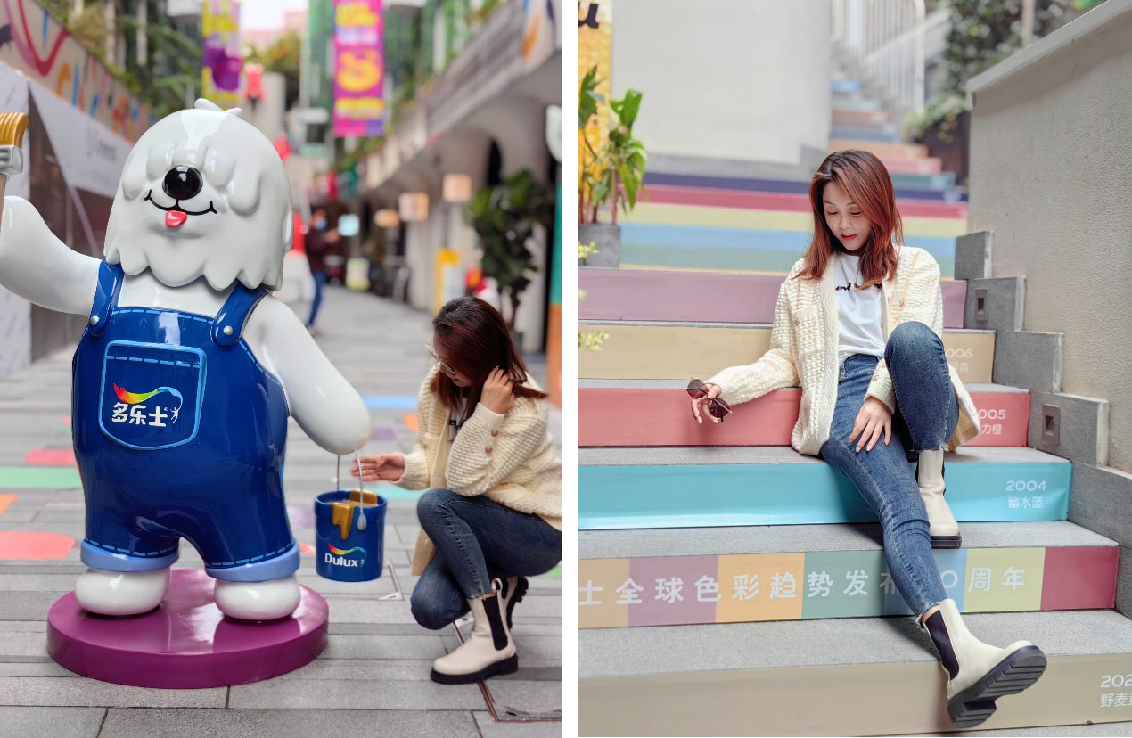 在mamǎfufú的入口處,朵朵和此次多樂士快閃活動的的品牌形象代言——古牧犬“多多”來了個親密合影;和通往二樓的“Dulux彩虹階梯”也打卡合照之后,快速參觀了多樂士20周年色彩墻,以及頗有創意的“靈感工廠“,朵朵迫不及待的來到了三層,找到了她此行的最心儀的”裸眼3D“體驗屋。