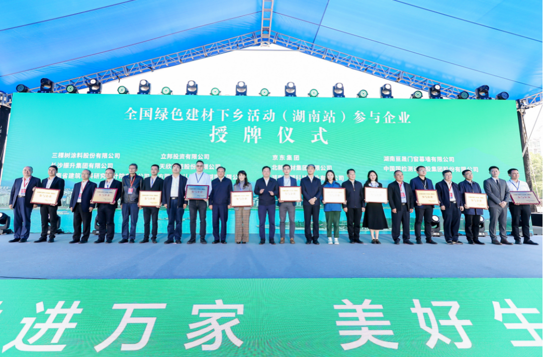 2022年全國綠色建材下鄉(xiāng)活動湖南站于11月1日在岳陽湘陰縣正式啟動。三棵樹全面支持綠色建材下鄉(xiāng)活動,積極開展全國綠色建材領(lǐng)軍企業(yè)惠民行動,獲得由湖南省工業(yè)和信息化廳、岳陽市人民政府特別頒發(fā)的“參與企業(yè)”授牌。