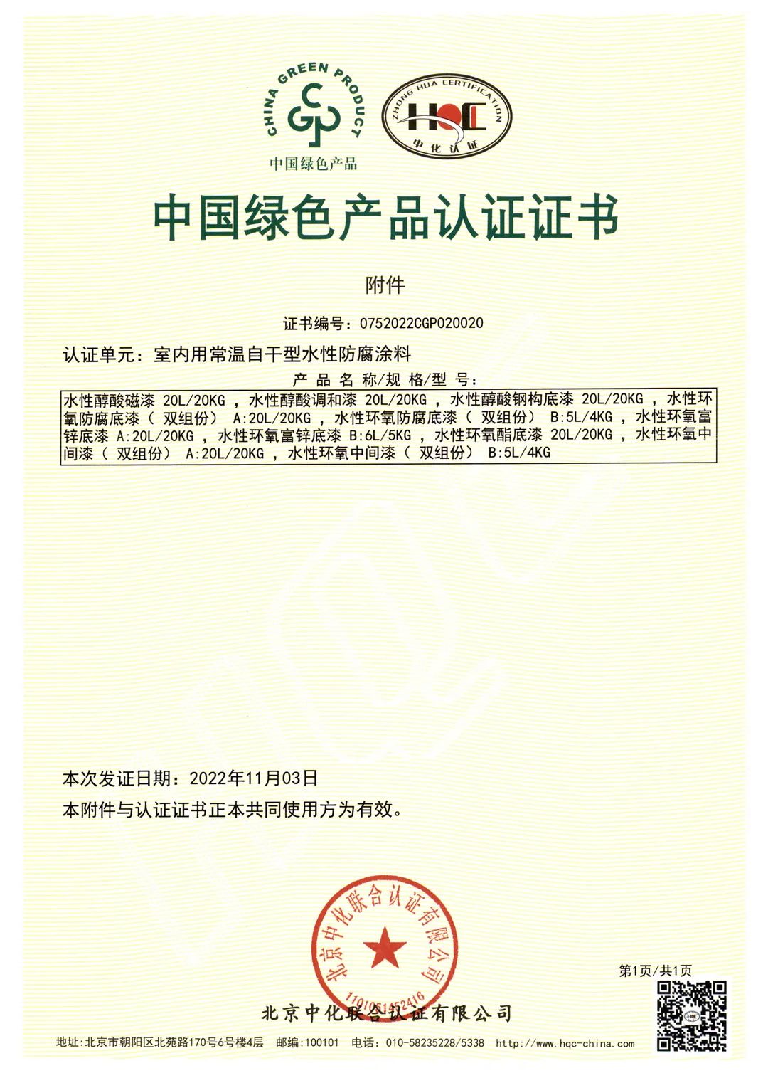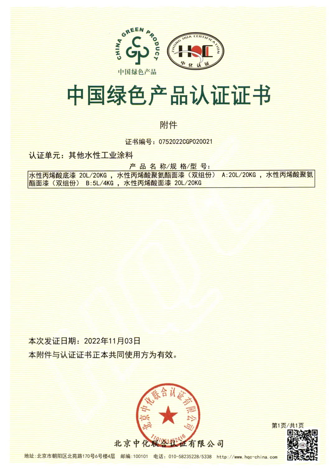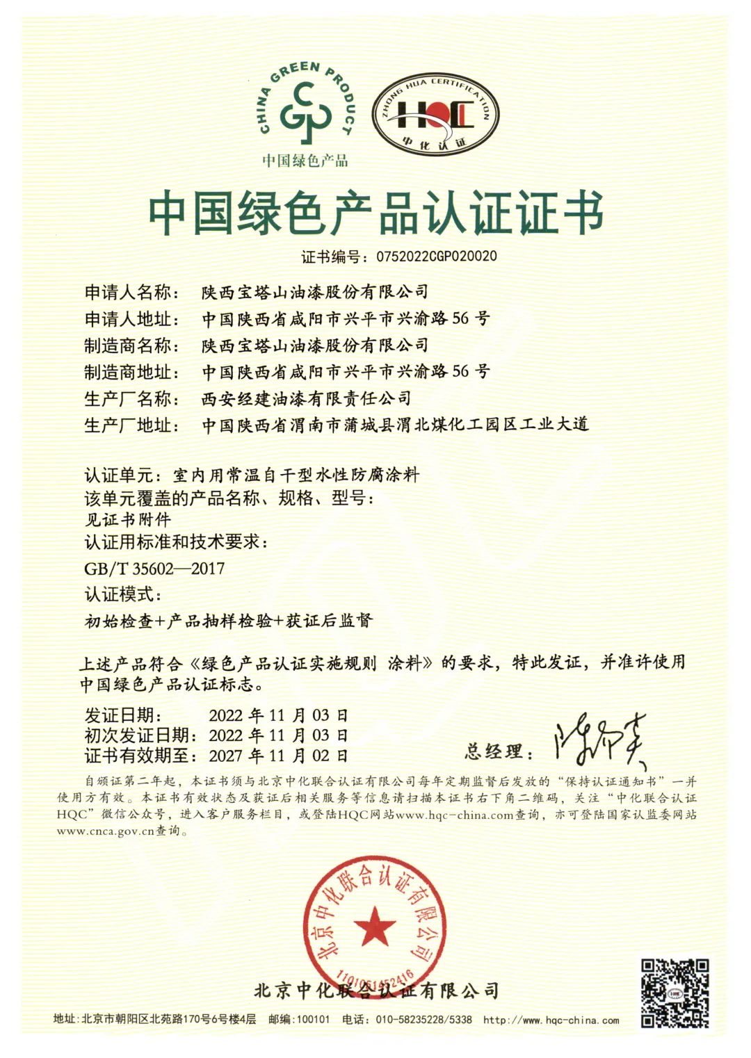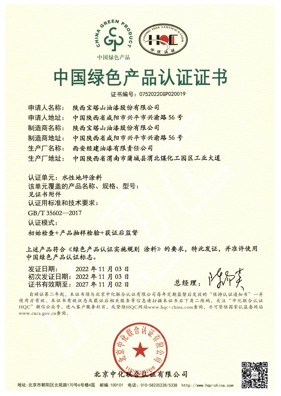 北京中化聯會認證有限公司(HQC)資深專家根據國家標準GB/T35602-2017《綠色產品評價 涂料》和CNCA-CGP-02:2021《綠色產品認證實施規則 涂料》的要求,對寶塔山漆水性地坪涂料、室內用常溫自干型水性防腐涂料、其他水性工業涂料3個單元11款產品,從資源、能源、環境、品質4大指標進行評審,并順利通過審核,獲得中國綠色產品認證。