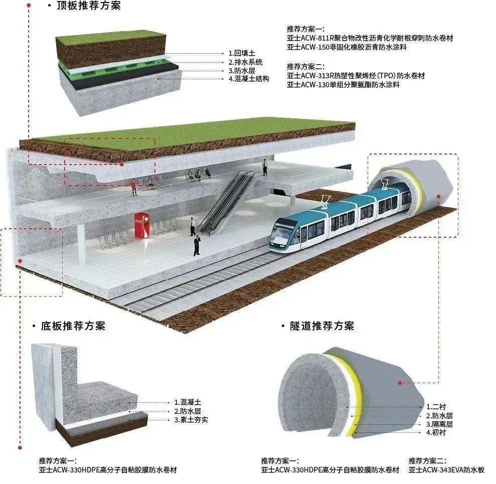 亞士防水針對不同結構形式提供不同的系統解決方案,選擇易于施工、安全環保、符合氣候條件的防水材料,以混凝土結構自防水為基礎,以整體外包防水層為輔助,以變形縫、施工縫等接縫防水為處理重點,達成“剛柔相濟、多道防線”的綜合治理體系,解決軌道交通工程在建設、運營各環節中存在的滲漏問題,助力“百年工程”防水無漏,質量無憂。