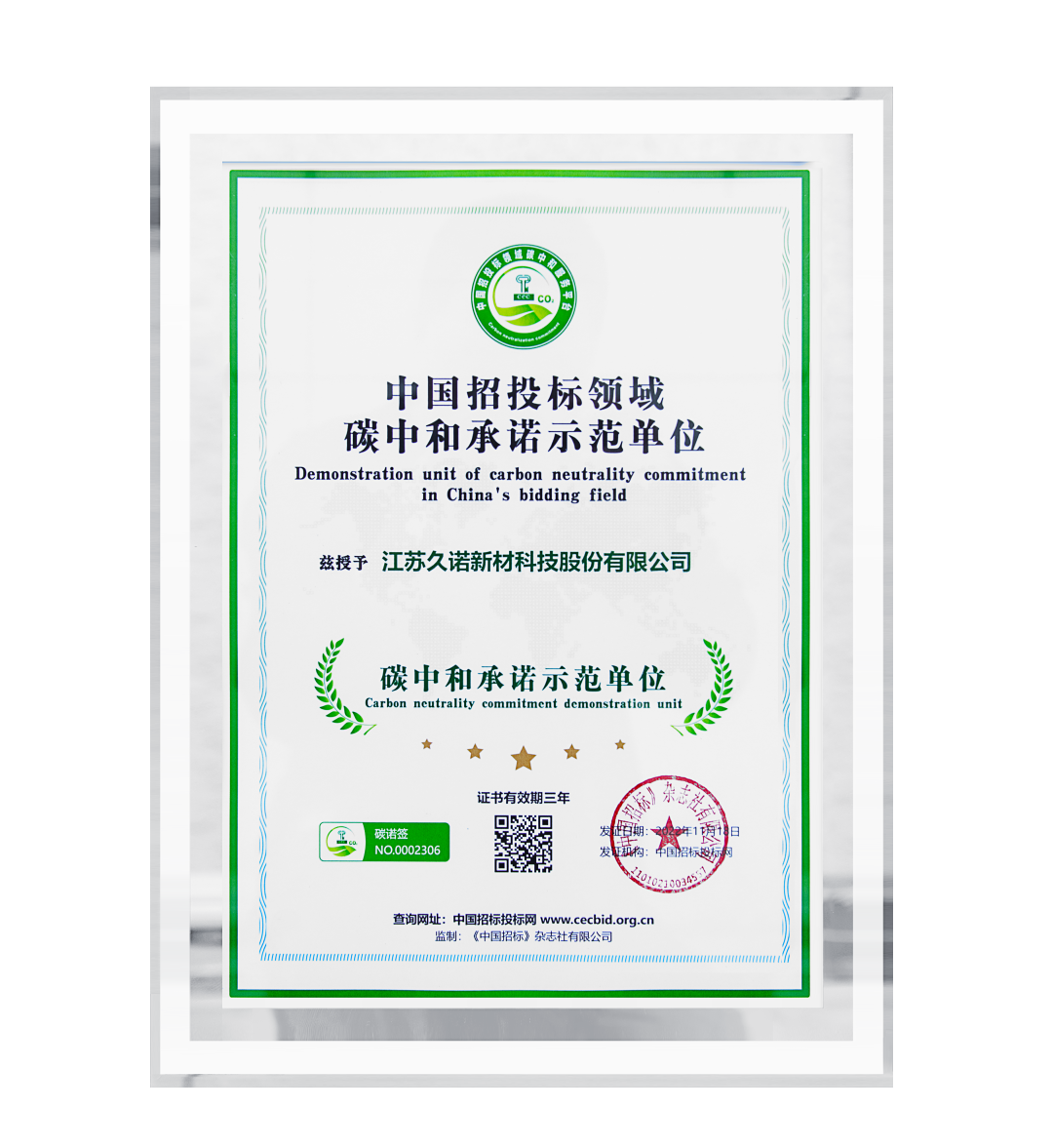 近日,由工信部組織的全國“碳中和承諾示范單位”評選公示中,久諾集團通過審核,被授予“碳中和承諾示范單位”榮譽證書,并在中國招投標網作為碳諾簽第0002306號展示。