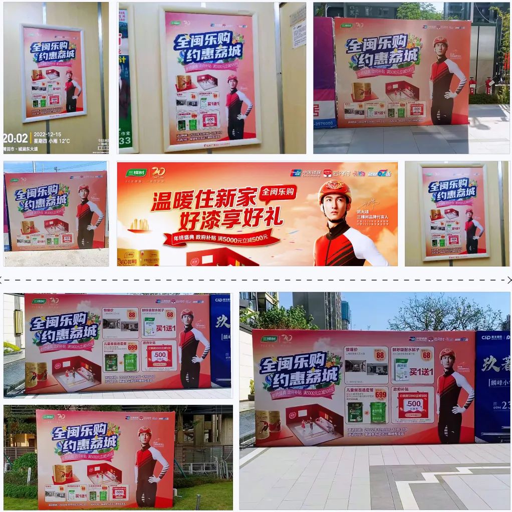 福建省170多家三棵樹專賣店參與活動,統一造勢,擴大影響力,每家門店內活動物料生動化布置,結合政府補貼,滿額立減,門店熱銷產品套餐,兒童漆買面送底,藝術漆雅典石驚爆價,膩子粉買1送1等促銷力度,實實在在給予消費者優惠。由政府做背書,通過銀聯云閃付APP掃碼支付即可直接享受立減,聚焦滿5000元立減500元,讓活動更有公信力,同時三棵樹線下投入大量活動廣告,各大小區電梯活動廣告,小區入口行架廣告,鋪天蓋地宣傳,惠滿全城,活動期間上千名業主選擇三棵樹,業主紛紛轉發朋友圈為三棵樹代言宣傳“全閩樂購”活動。