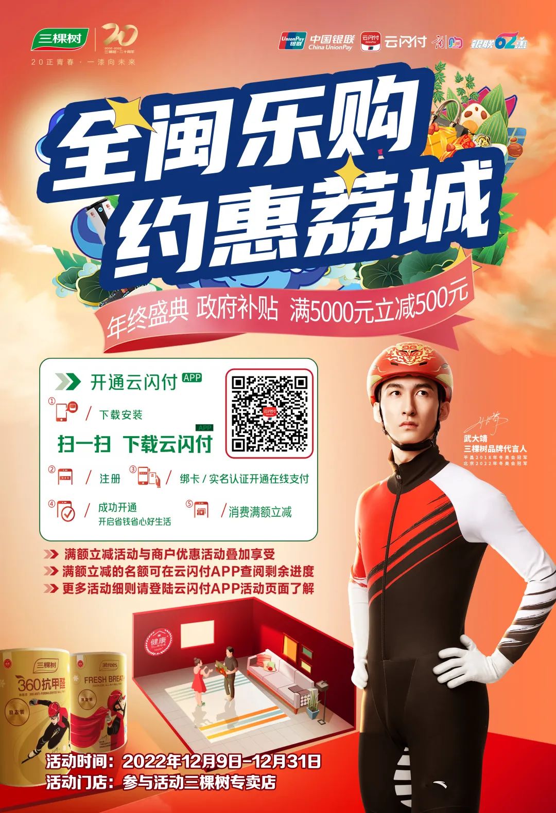“全閩樂購 約惠荔城”三棵樹專場年終促消費活動在2022年12月9日-31日盛大開展,莆田荔城區政府及三棵樹集團共同注資百萬現金促消費,通過云閃付平臺立減,門店產品讓利,實實在在讓老百姓獲得實惠,提升廣大業主的裝修欲望,提振消費信心,帶動莆田GDP發展。