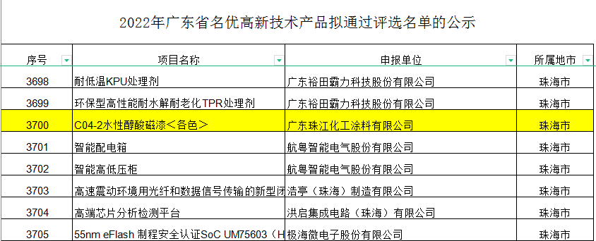 近日,廣東省高新技術企業協會公布了2022年廣東省名優高新技術產品擬通過評選名單,珠江涂料申報的各色C04-2水性醇酸磁漆產品成功入選“2022年廣東省名優高新技術產品”名單。
