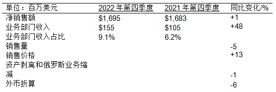 2022年第四季度各業務部門業績表現