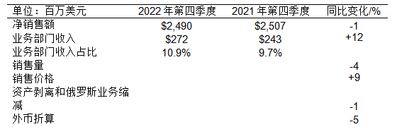 本業務部門收入僅增長了5000萬美元,主要是因為銷售價格上漲和重組成本節約大部分被銷售量下降、原材料和能源成本增加、負面外幣折算等因素抵消。與2021年第四季度相比,工業涂料業務部門的利潤率提高了290個基點。