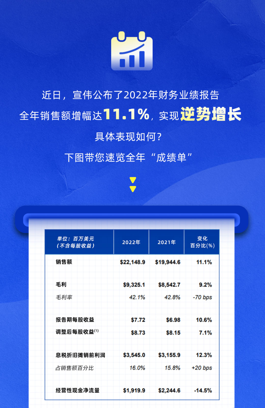 近日,宣偉公布了2022年財務業(yè)績報告全年銷售額增幅達11.1%,實現(xiàn)逆勢增長具體表現(xiàn)如何?本文帶您速覽其全年“成績單"。