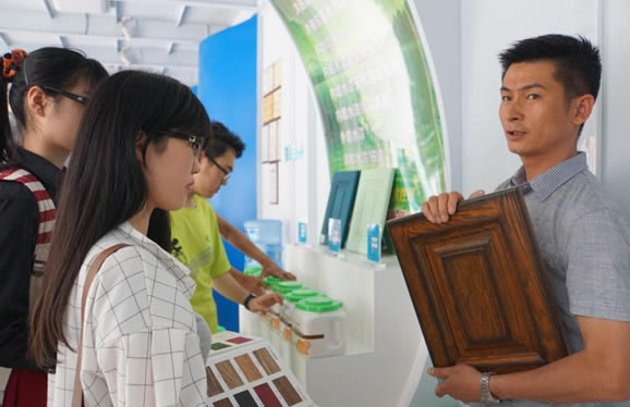 拿起板刷,在樣板上來回涂抹;風干后,學生們觸摸漆面的質地,觀察成品的效果,在實地研究學習水漆涂裝效果。近日,根據高等教育有關校企合作走“產、學、研”相結合道路的發展要求,武漢華中科技大學建筑系14級學生前往晨陽水漆武漢旗艦店實地觀摩學習水漆的調配與涂刷過程。晨陽水漆武漢地區銷售代表王金偉為同學們進行了地坪漆及內墻漆種類、參數、施工方法等一系列的培訓講解。