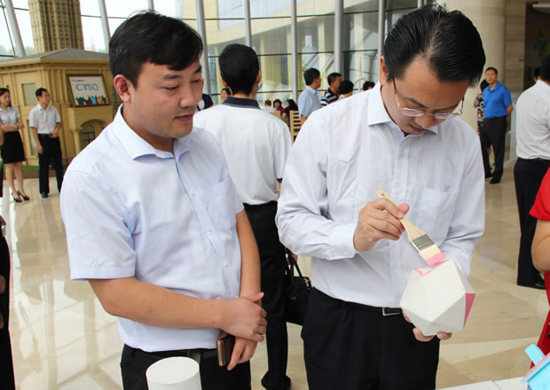 19日,中科院專家一行在保定市科技與知識產權局的帶領下重點對晨陽水漆進行了參觀考察,先后觀摩了晨陽水漆宣傳片、工程施工樣板、企業(yè)生產車間,并在現(xiàn)場試刷體驗。專家們對晨陽水漆的環(huán)保特性表現(xiàn)出了極大的興趣,對粉刷完的小玩具愛不釋手,紛紛表示今后愿意以身作則,充當水漆的推廣員。