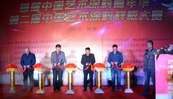 隨著中國(guó)涂料工業(yè)協(xié)會(huì)副秘書長(zhǎng)劉杰、中國(guó)涂料工業(yè)協(xié)會(huì)藝術(shù)涂料涂裝分會(huì)理事長(zhǎng)陶文生、秘書長(zhǎng)梁海生、杭州裝飾裝修商會(huì)涂料委會(huì)長(zhǎng)樓紅龍手中的紅綢飄然落下,標(biāo)志著首屆中國(guó)藝術(shù)涂料嘉年華暨第二屆中國(guó)藝術(shù)涂料樣板大賽于2016年12月17日在杭州拉開帷幕。浙江省涂料工業(yè)協(xié)會(huì)秘書長(zhǎng)馬新華、廣東省涂料行業(yè)協(xié)會(huì)秘書長(zhǎng)呂水列應(yīng)邀出席了活動(dòng)啟動(dòng)儀式。來自藝術(shù)涂料企業(yè)代表、涂裝工程師、下游經(jīng)銷商、代理商等共計(jì)將近1 300人參加了此次活動(dòng)。