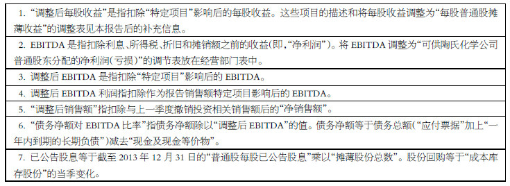 陶氏報表顯示,2013 年每股收益為 3.68 美元,調(diào)整后每股收益為2.48 美 元,同比增長31%,而2012 年每股收益 為0.70 美元,調(diào)整后每股收益為1.90 美元。